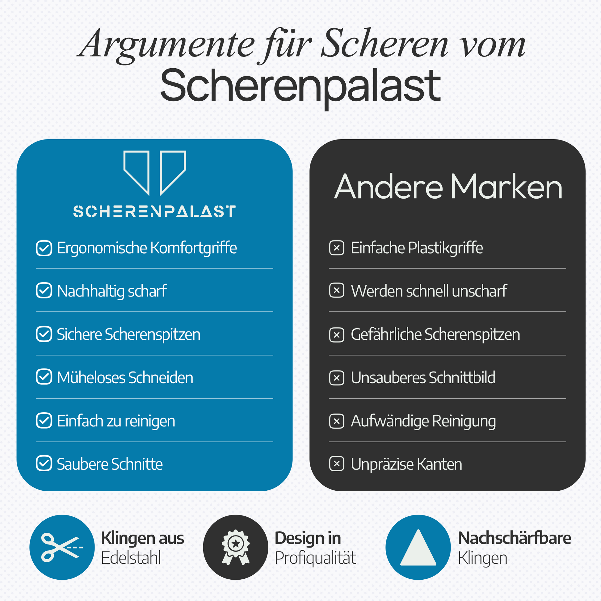 Besonders praktisch: Die Scheren sind sowohl für Rechts- als auch für Linkshänder geeignet. In Deutschland geprüft und mit der Bestnote 1,1 („Sehr gut“) im Warentest online ausgezeichnet, überzeugt dieses Set durch Qualität und Langlebigkeit.