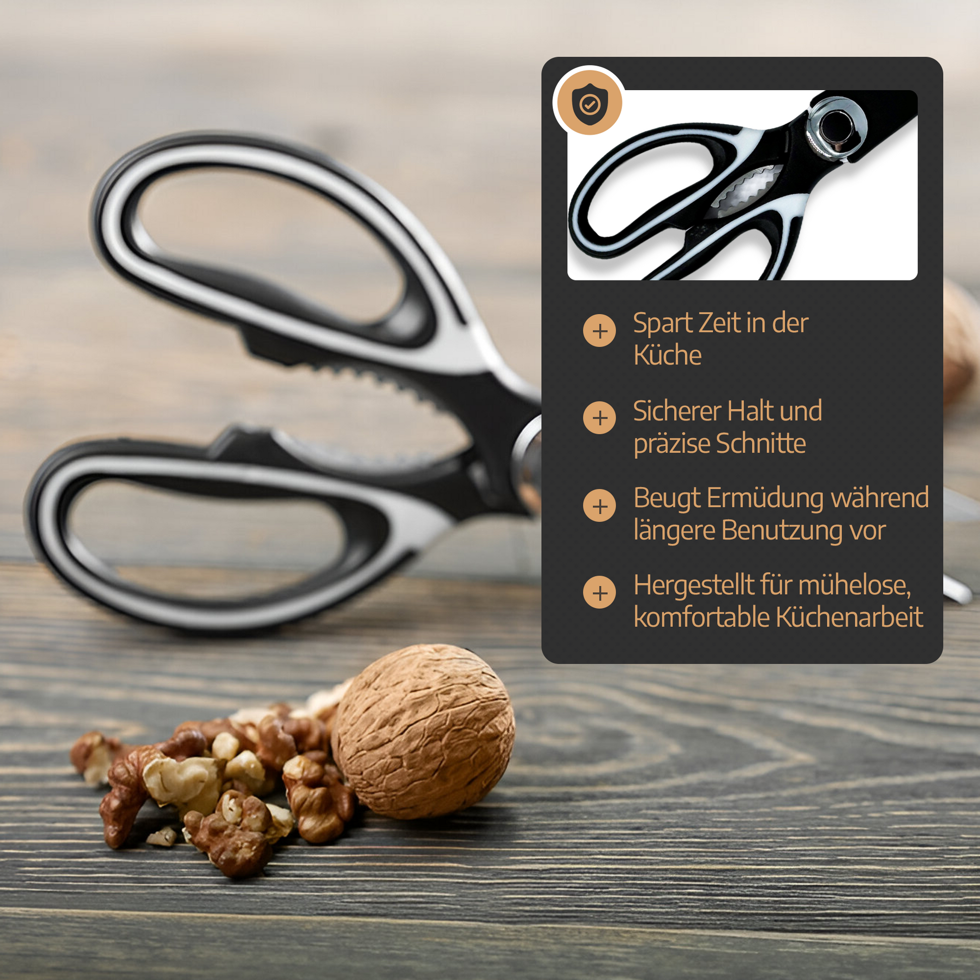 Die multifunktionale Küchenschere bietet zusätzlich einen integrierten Flaschenöffner und Nussknacker, wodurch sie gleich mehrere Werkzeuge in einem ersetzt. Der rutschfeste, ergonomische Griff ermöglicht komfortables Arbeiten für Rechts- und Linkshänder.